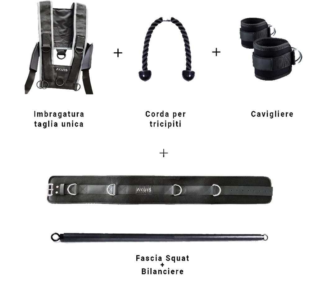 A complete set of gripping elements for a full body workout. Included are the Traction Rope for triceps training, a pair of Ankle Ropes for leg training, an Adjustable Squat Belt, a Barbell and the Chest Sling (one size fits all), useful for aerobic activities, sprints, jumps and generally for exercises involving the lower body.